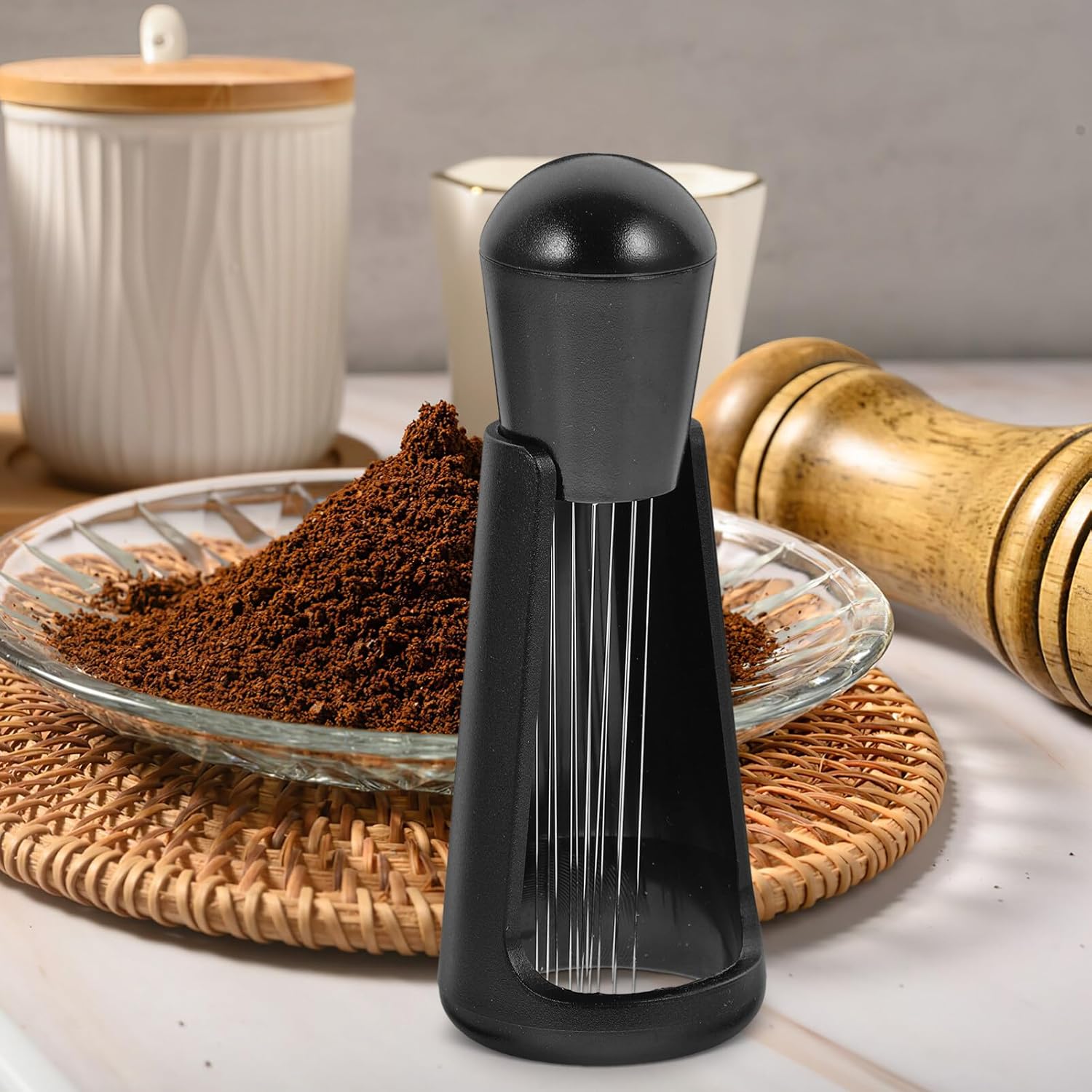 The tool features fine stainless steel needles that gently stir your coffee grounds in the portafilter, breaking up clumps and evenly spreading the coffee before tamping. This leads to better water flow, consistent pressure, and richer, smoother espresso.