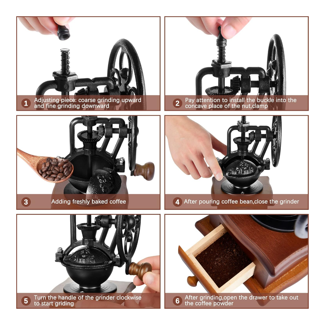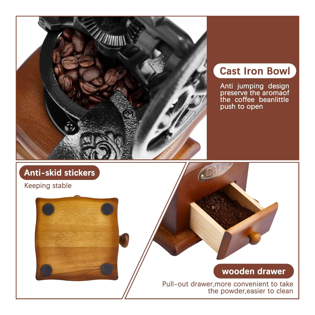 With its vintage design and durable build, this coffee grinder is both a functional tool and a stunning countertop piece. The pull-out drawer conveniently collects the ground coffee, while the included brush and scoop make cleanup simple and easy.